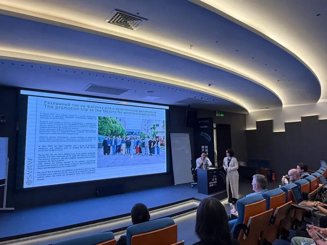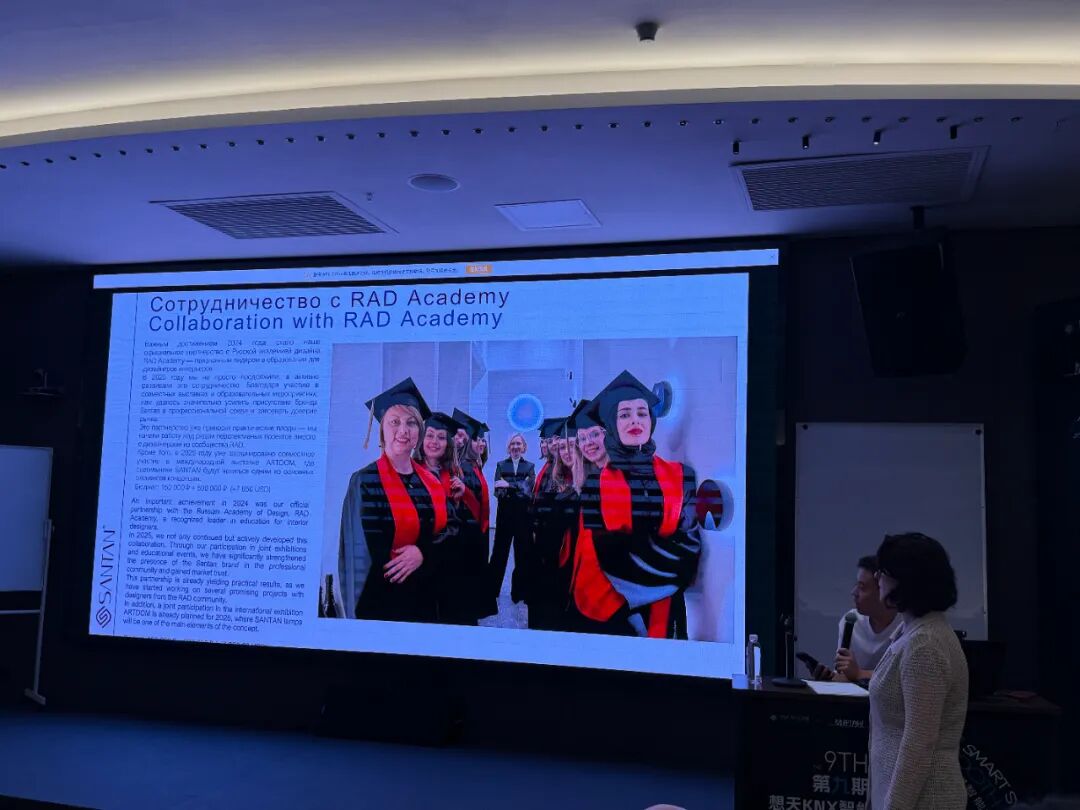 会议伊始,Anastasia女士率先分享了2025年的整体推广成果。他重点回顾了想天品牌在俄罗斯市场的一系列高能动作:1.在4月组织10多位设计大咖来总部参观交流;2.想天产品相继亮相俄罗斯当代艺术与设计领域的顶级展会、俄罗斯家居展、设计师沙龙等核心活动;3.参与莫斯科多场专业展览与论坛活动,大幅提升品牌曝光度;4.在当地展厅多次组织设计师“产品应用培训”,帮助设计师与工程团队深入理解智能灯光的应用逻辑;5.多家行业媒体与设计杂志深度报道与推广想天产品;6.并与俄罗斯设计学院建立合作关系,为未来的教育推广与人才培养奠定坚实基础。这些成果不仅推动了智能灯光在俄罗斯市场的渗透率,也进一步巩固了SANTAN想天在当地的高端品牌形象。