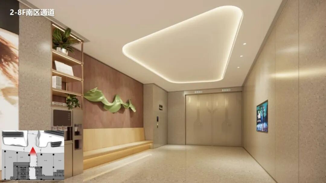 从1F “溪”的灵动流转,营造亲近自然的起点;2–6F“枝、果、花、叶、露”层层递进,空间情绪随楼层不断生长;到7 - 8F “云”的缥缈,每一层都成为自然景致的延展。同时,同步呼应“值此青绿、夏林苍翠、秋风丹染、携光而行”的四季主题,赋予空间时间维度上流动的美感。让光成为时间的表达媒介,使空间在不同季节中呈现不同的情绪与温度。
