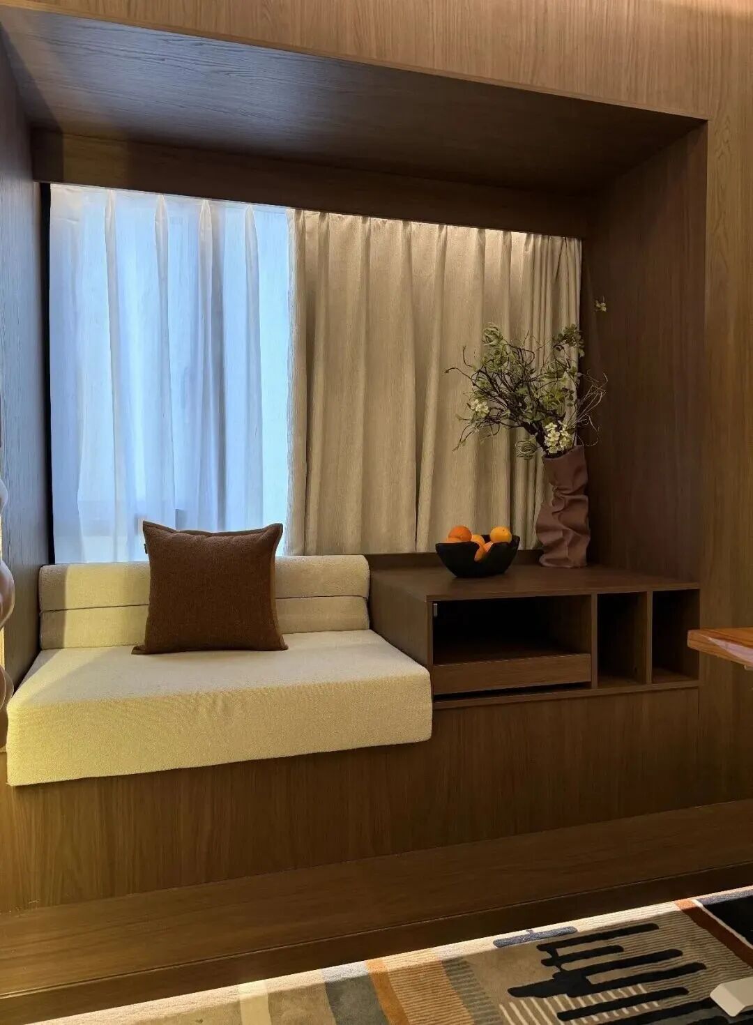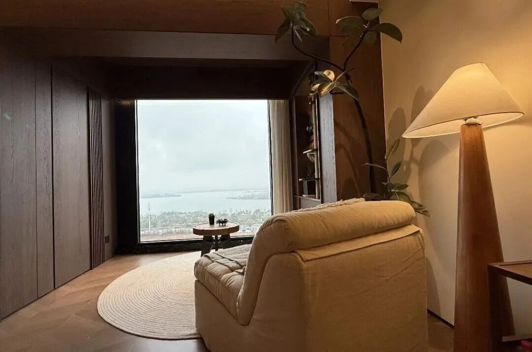 将湖景引入生活,改造前,松雅湖边的景观阳台原本拥有绝佳视野,却因老旧窗格与护栏的分割,视线受阻,功能也仅停留在晾晒衣物。设计师吴晓波对阳台进行了颠覆式改造:将旧窗更换为整面落地玻璃窗,让松雅湖的景色如同一幅巨大的自然画作被引入室内。阳台被重新打造为舒适的休闲阅读空间,同时设置猫爬架与宠物系统,满足欧磊与猫咪互动的需求。这里既可以是独处冥想的角落,也可以是与朋友小酌谈天的空间,让自然景观与生活情趣在此融合。