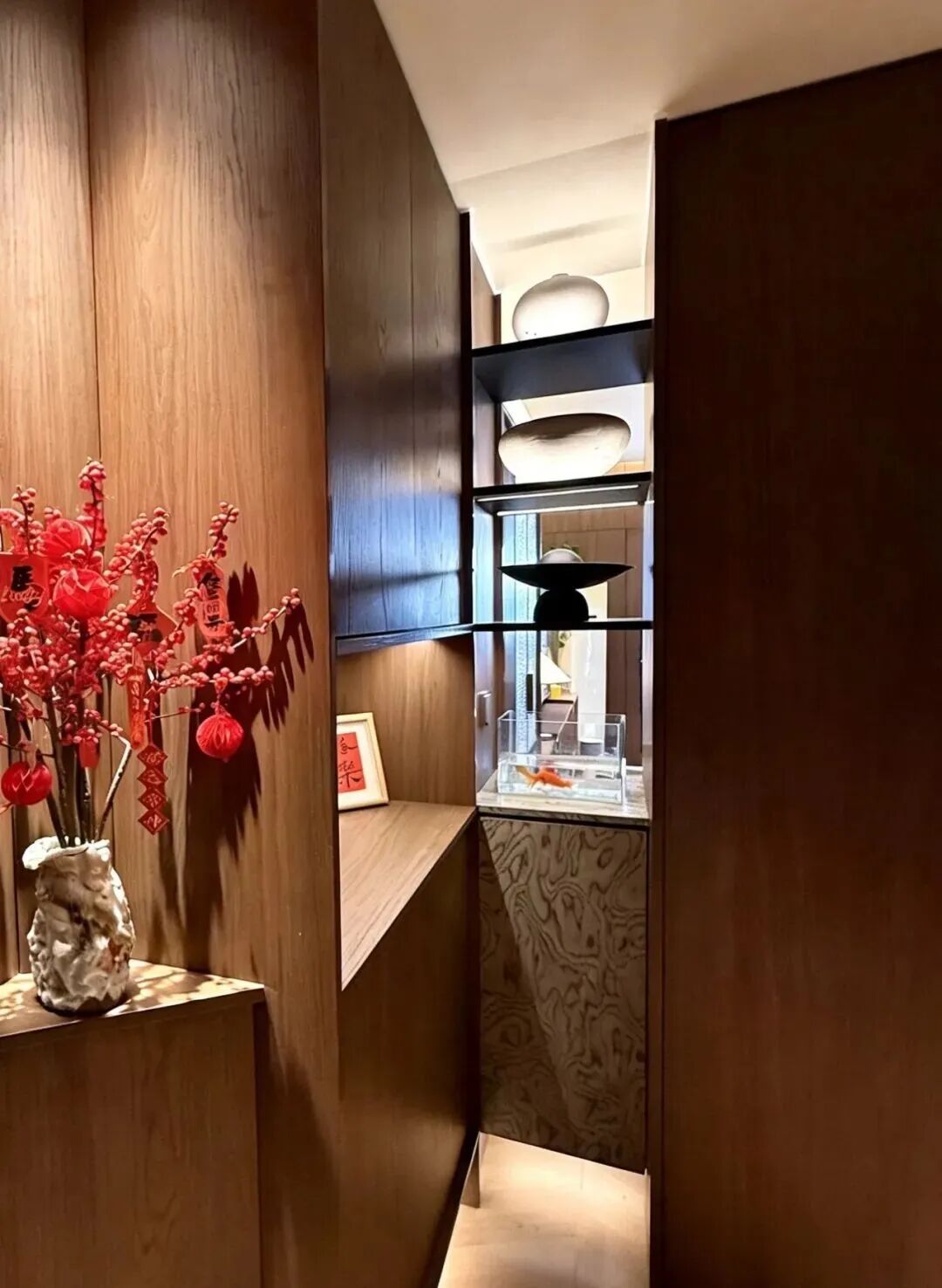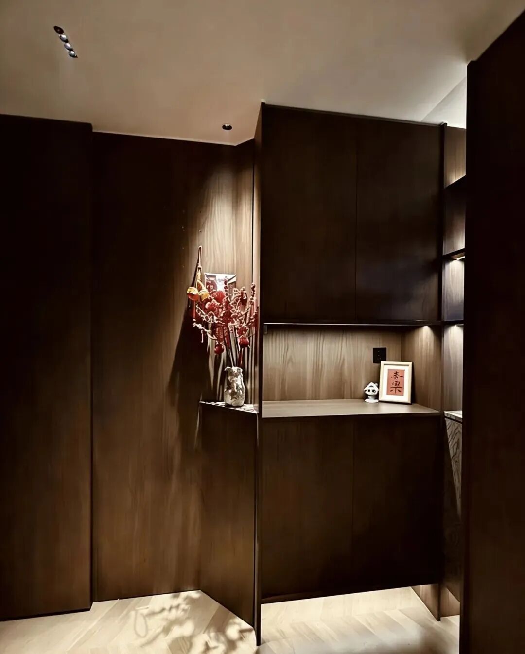 从入户玄关开始,设计师吴晓波便为这场“归家之旅”定下从容的基调,让玄关成为家的温柔序章。改造前,玄关空间凌乱无序:鞋物散落、缺乏收纳,回家的仪式感几乎消失。在改造中,设计师吴晓波通过系统化收纳柜体重新组织空间,让鞋、包、衣物各归其位,使动线更加清晰有序。同时搭配想天智能感应灯光,当人进入玄关,灯光缓缓点亮,营造出温暖的归家氛围。无论是出门前的整理,还是回家后卸下随身物品的瞬间,光线落在每一件物品上,都让日常生活多了一份优雅的仪式感。