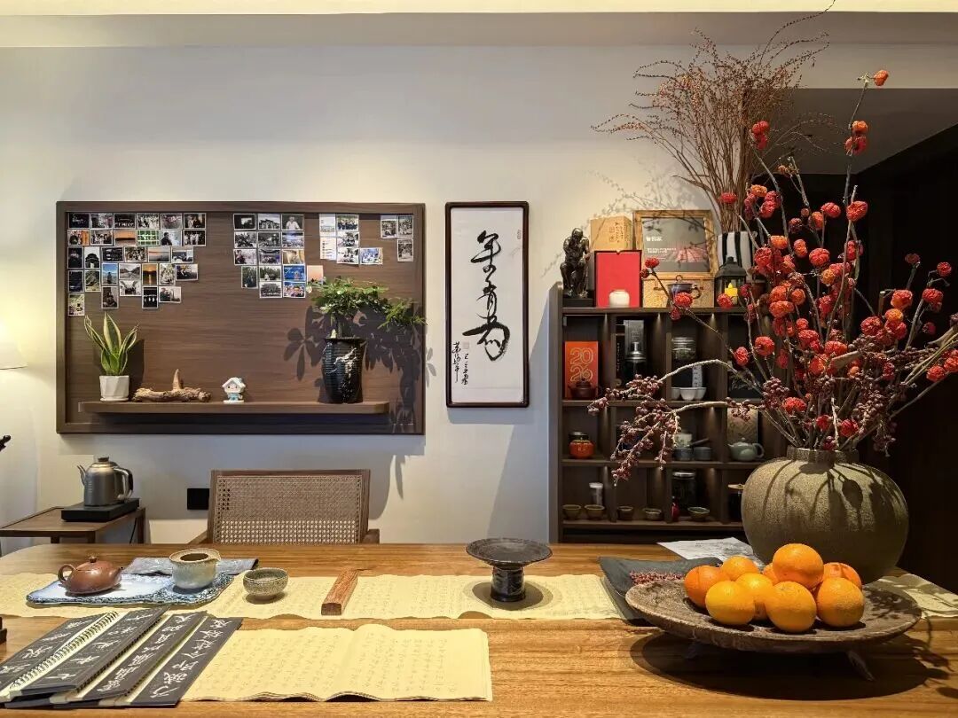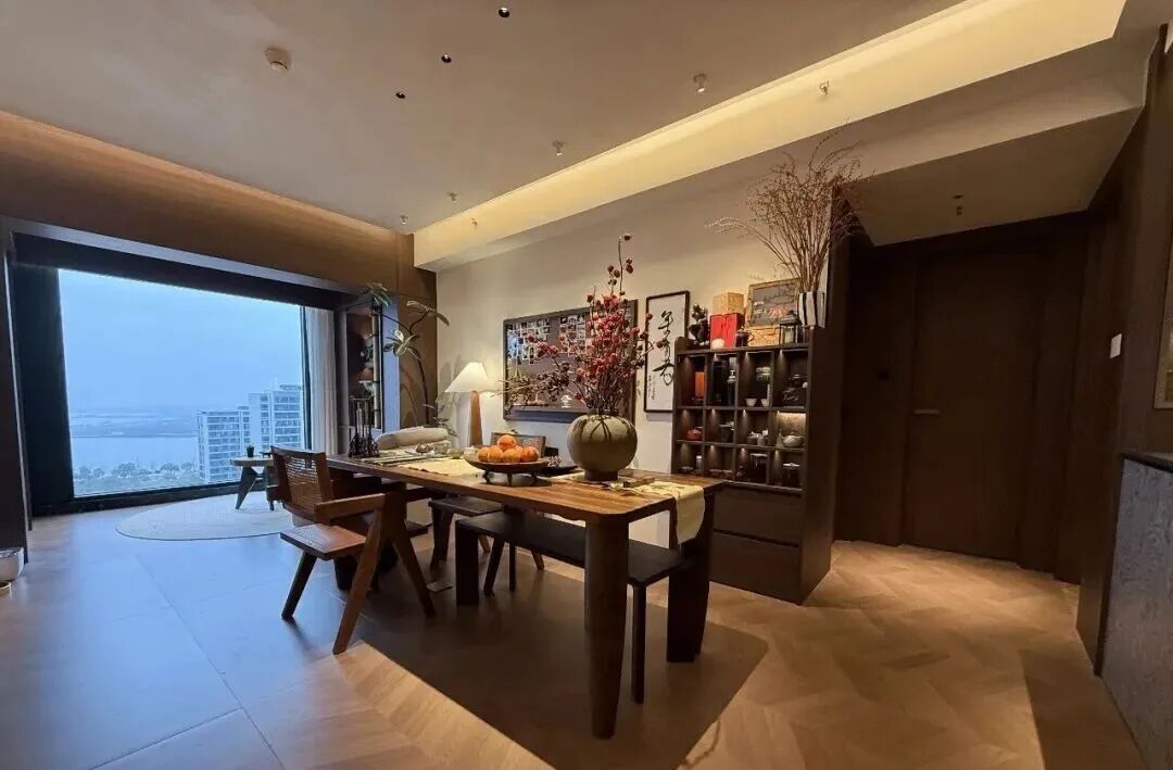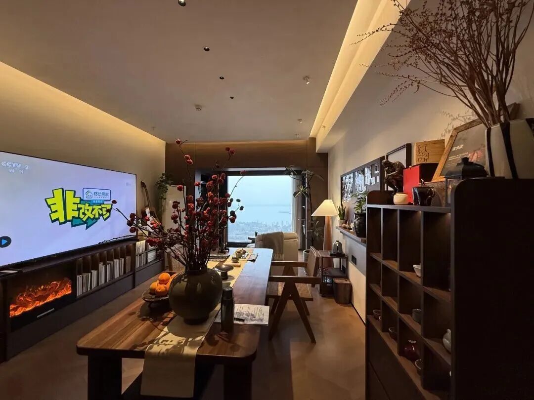“去客厅化”的多元生活空间,在客厅设计上,设计师吴晓波大胆提出了“去客厅化”的设计理念。传统客厅往往被大型沙发占据,功能单一,空间利用率不高。改造中,设计师移除了占地庞大的沙发,重新构建出更加灵活的生活场景。空间被划分为多个复合功能区域:一侧打造安静的茶座与书写区,满足欧磊读书、品茶与文字工作的需求;中央区域则保持开放灵活,可会客、观影或多人聚餐。通过这样的空间重构,原本“大空间、小生活”的客厅,被转变为承载多元生活方式的核心区域。