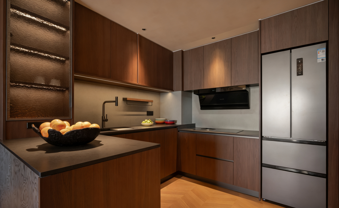 高显色指数,还原真实色彩,在灯光设计上,想天智能灯光的高显色指数光源让食材与水果的色彩真实呈现。设计师吴晓波特别提到:“想天灯光的显色指数非常好,你看照在橙子上的色彩,还原度非常真实。”当灯光落在餐桌、器皿与食材上时,呈现出接近自然光的色彩表现,不仅提升了空间质感,也让日常生活更加生动。